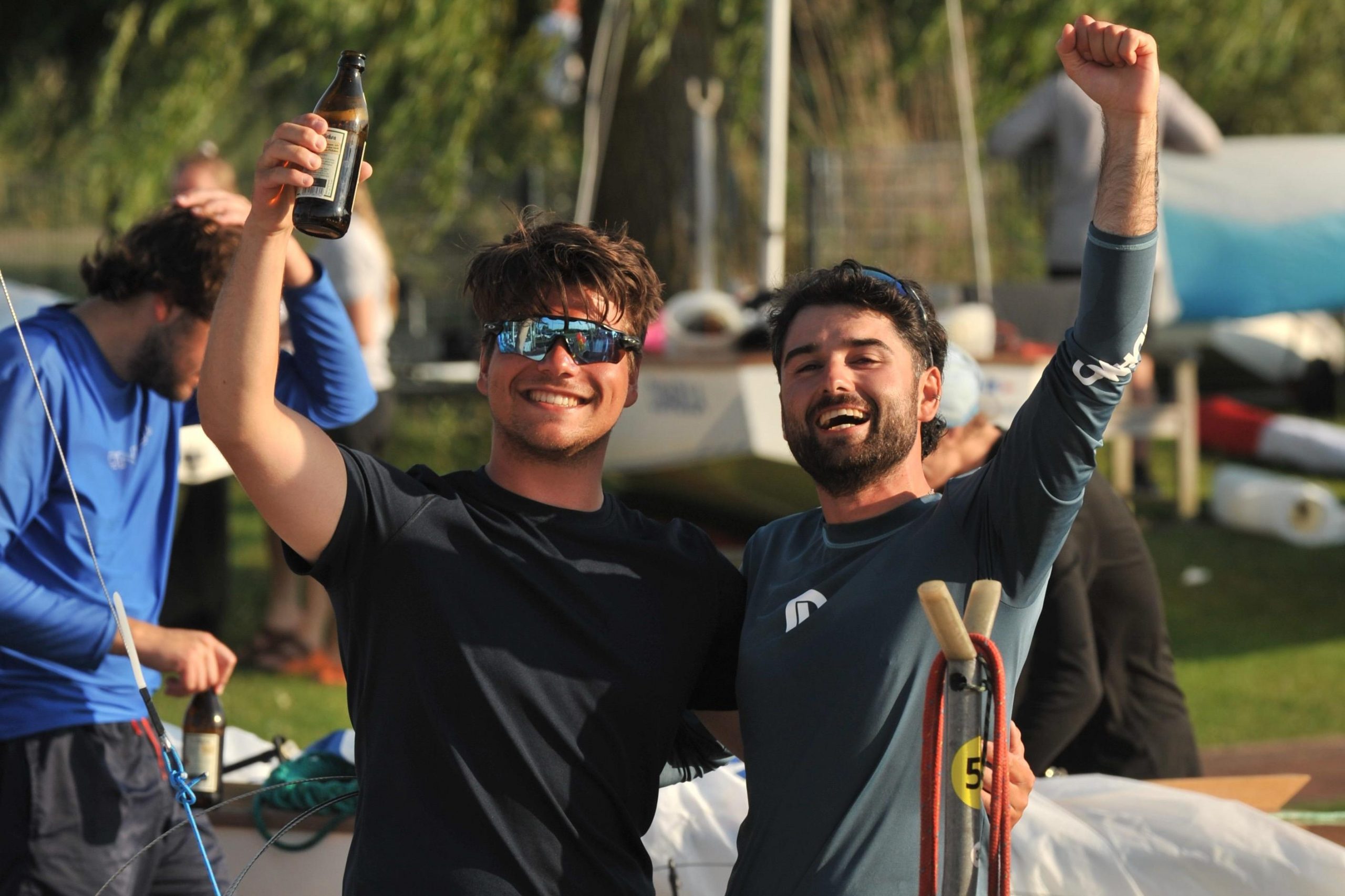 Die Freude war bereits auf dem Wasser groß und setzte sich im Hafen fort, wo wir von Freunden und Vereinskameraden mit Musik und kühlen Getränken empfangen wurden. Nach dem Abbauen des Bootes folgte die Siegerehrung, bei der wir ganz oben auf dem Treppchen standen und unseren Erfolg gemeinsam mit den anderen Teams feiern konnten. Den Abschluss bildete eine willkommene Abkühlung im Dümmersee an einem extrem heißen Tag.